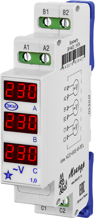 Для контроля напряжения в однофазных сетях подключение любого входа производится без учёта расположения фазного и нулевого проводников. Для контроля линейных напряжений в трёхфазных сетях нулевую шину следует подключить к каждому входу вольтметра. Для контроля фазных напряжений подключение каждого входа вольтметра производится между фазами.
